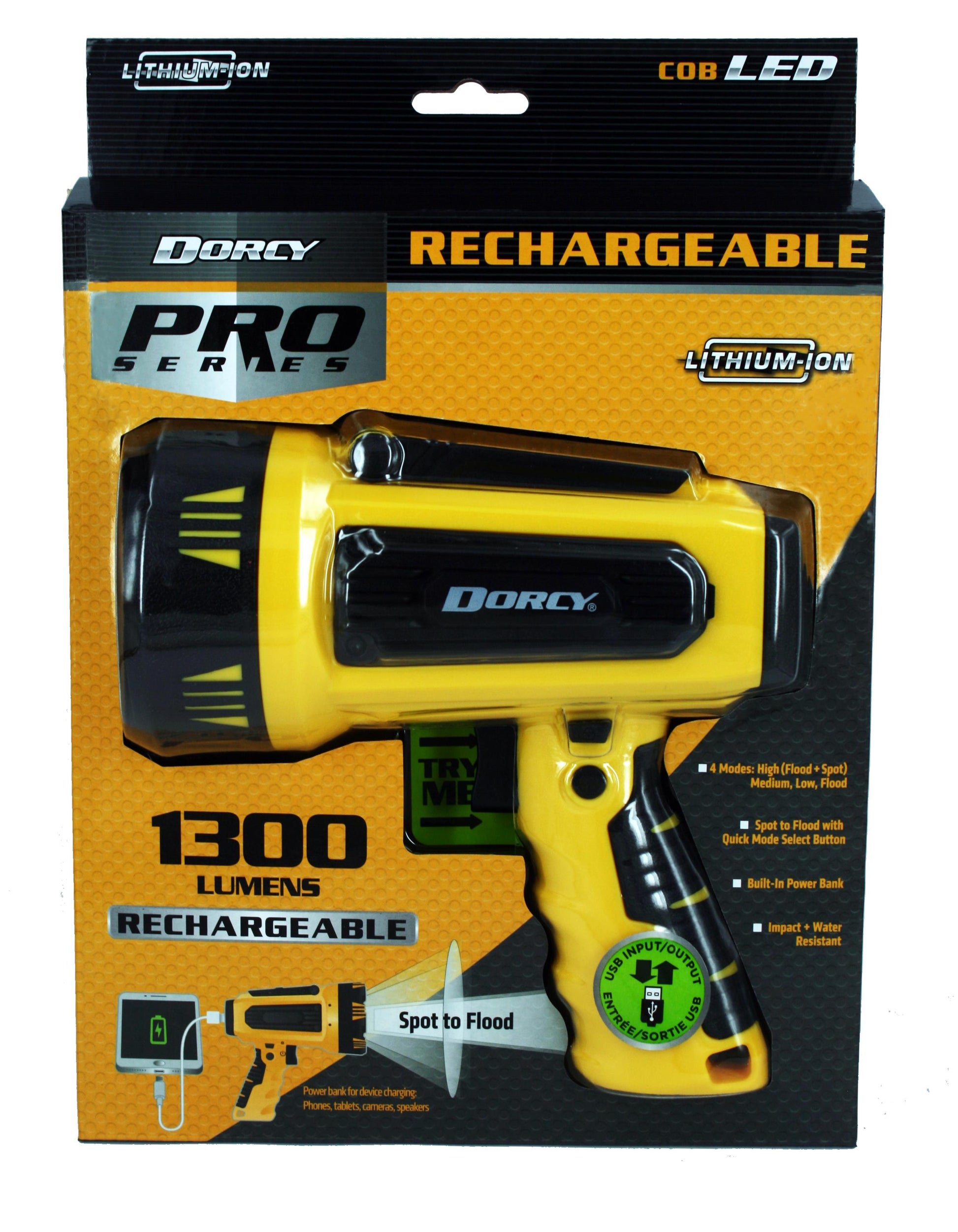 The Dorcy USB Rechargeable 1300 Lumen Spotlight (D4322) is a high-performance lighting solution built for serious outdoor adventures. With four modes—high, medium, low, and flood—it offers up to 5.5 hours of runtime on high at 1300 lumens, or 13 hours on low at 200 lumens. The quick-access mode button beside the trigger makes switching modes effortless, while the trigger lock and fold-out stand allow for hands-free use when needed. Powered by a 4400mAh lithium-ion battery, this spotlight is USB rechargeable and can even charge your other devices via its built-in USB output port—perfect for camping, roadside emergencies, or extended trips off the grid.